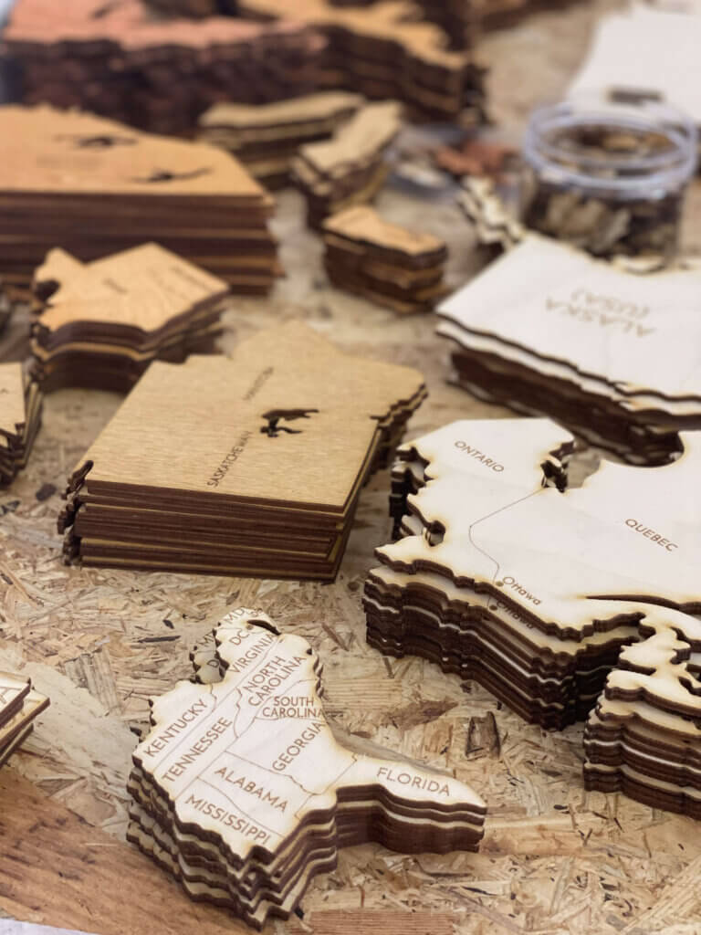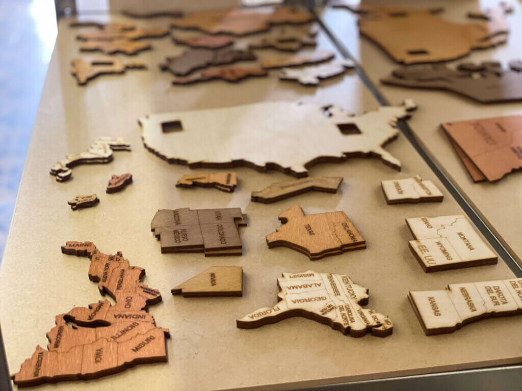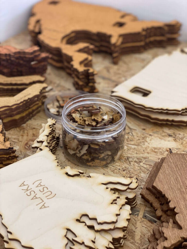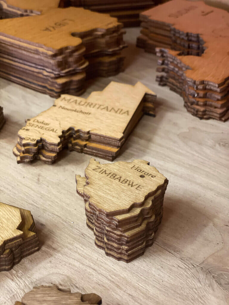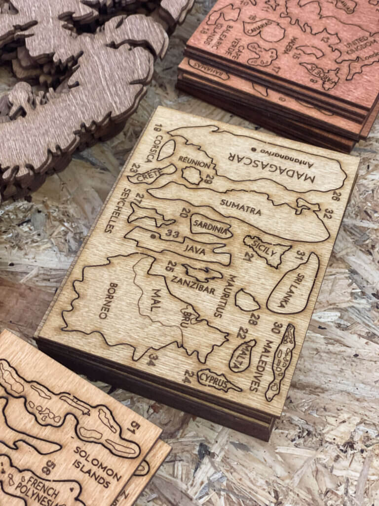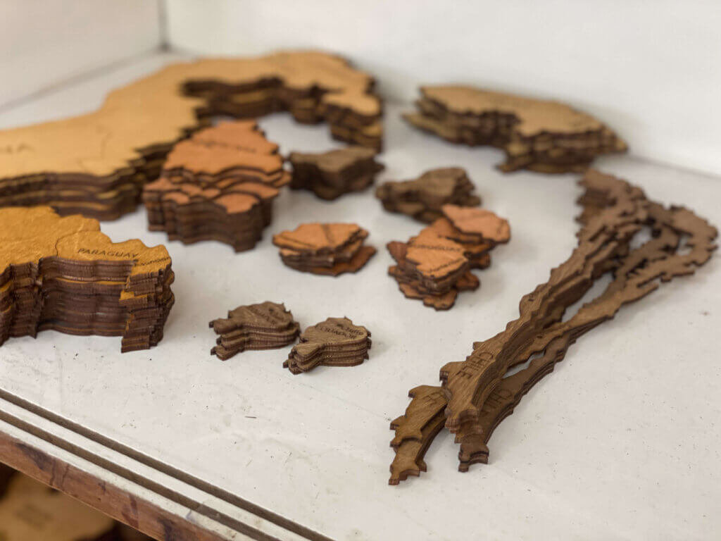 Myśli i pomysły są następnie przetwarzane na wektory. Te komputerowe zera i jedynki są przenoszone przez maszyny grawerujące na sklejkę, która jest następnie barwiona różnymi kolorami, aby uzyskać jeszcze bardziej imponujący projekt 3D. Stopniowo każdy element, każdy kraj, każda wyspa ożywa. Wszystkie małe części są następnie ręcznie sklejane i tworzą poszczególne kontynenty - drewniana mapa 3D uzyskuje swoją ostateczną formę.